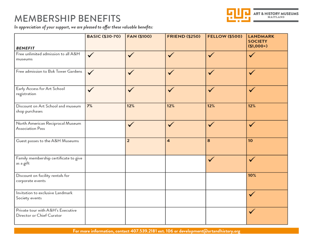Membership at the Art & History Museums of Maitland (A&H) is more than just a pass: It’s a connection to Central Florida’s creative legacy. As a member, you’ll enjoy a full year of benefits, including: