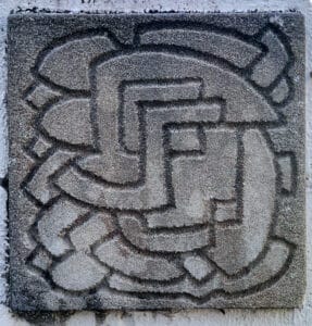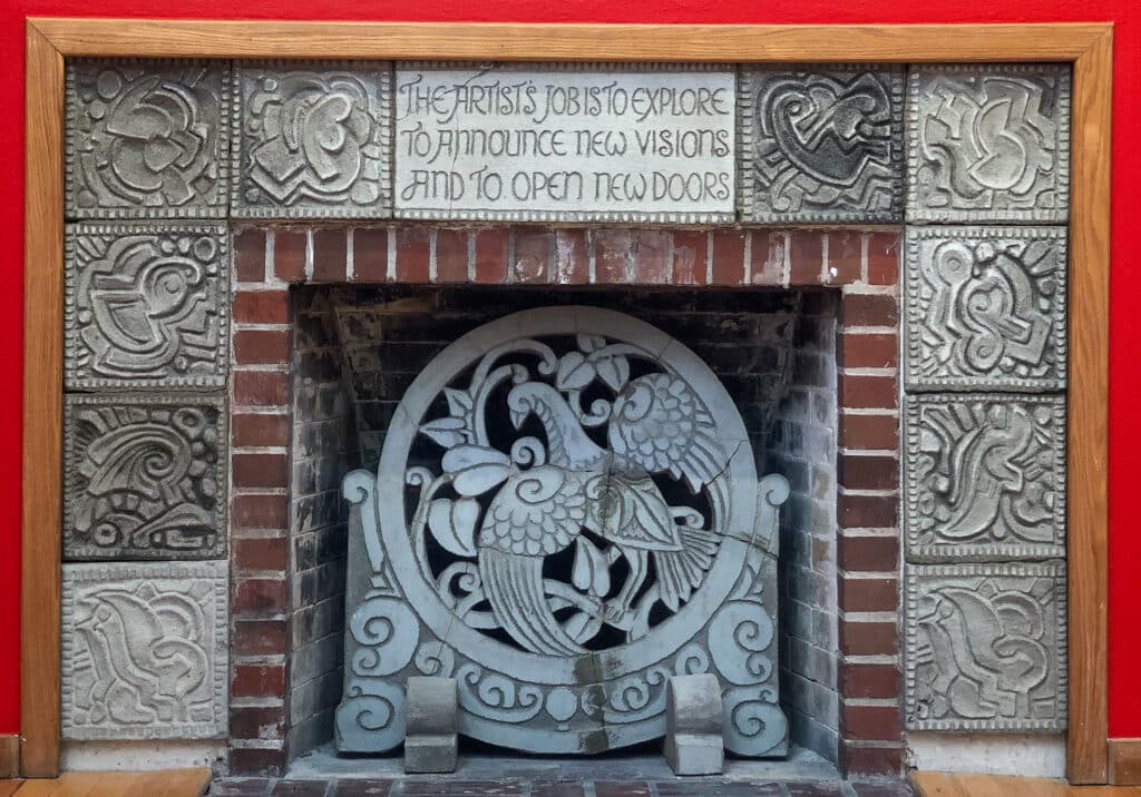 Much of Smith’s sculptural work at the Research Studio was originally painted in vivid hues using alabastine, a powdered mineral paint made from gypsum mined near Grand Rapids, Michigan. When mixed with water, alabastine resembles plaster and can be applied directly to concrete, making it ideal for raised decorative elements and reliefs.