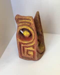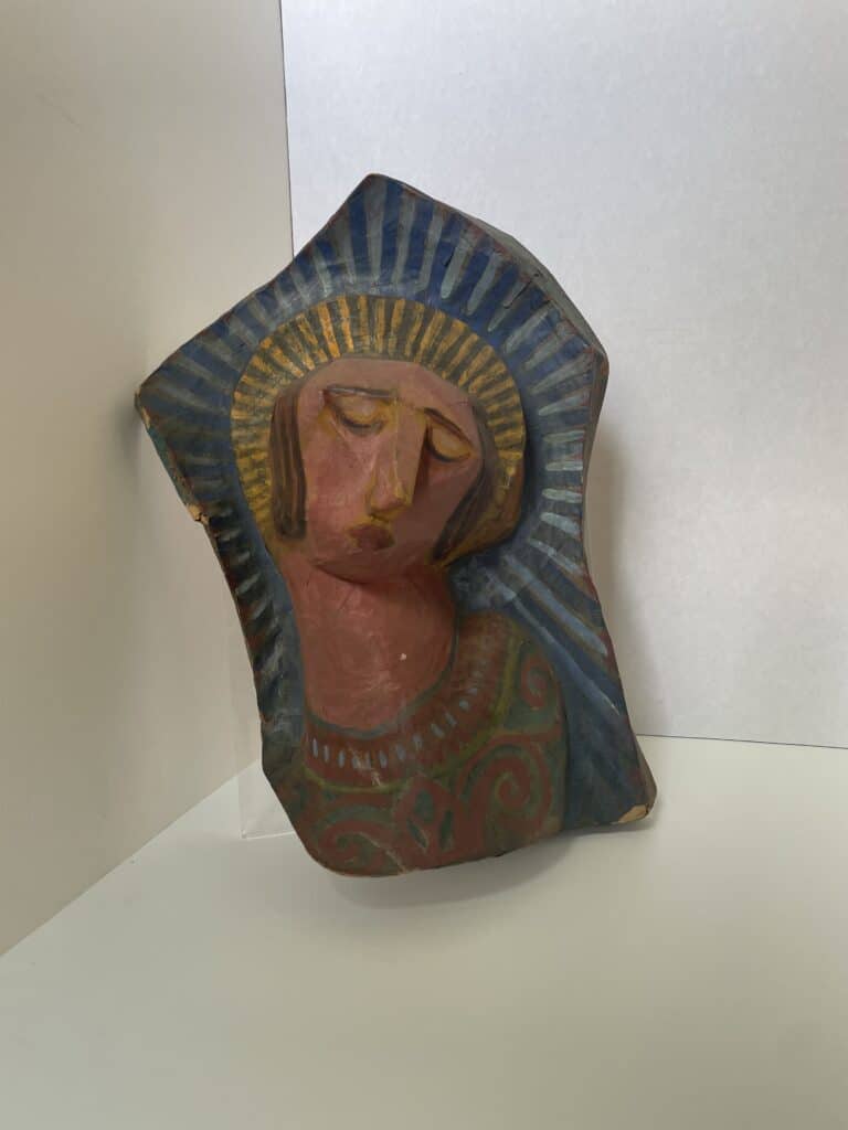 As his eyesight declined later in life, Smith turned to paper mâché as an alternative medium. This wall-hanging sculpture, affectionately nicknamed “Paper Mary”, reflects his enduring faith and his interest in religious iconography, a recurring theme throughout his work.